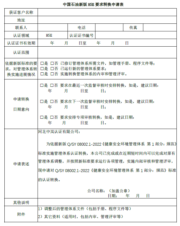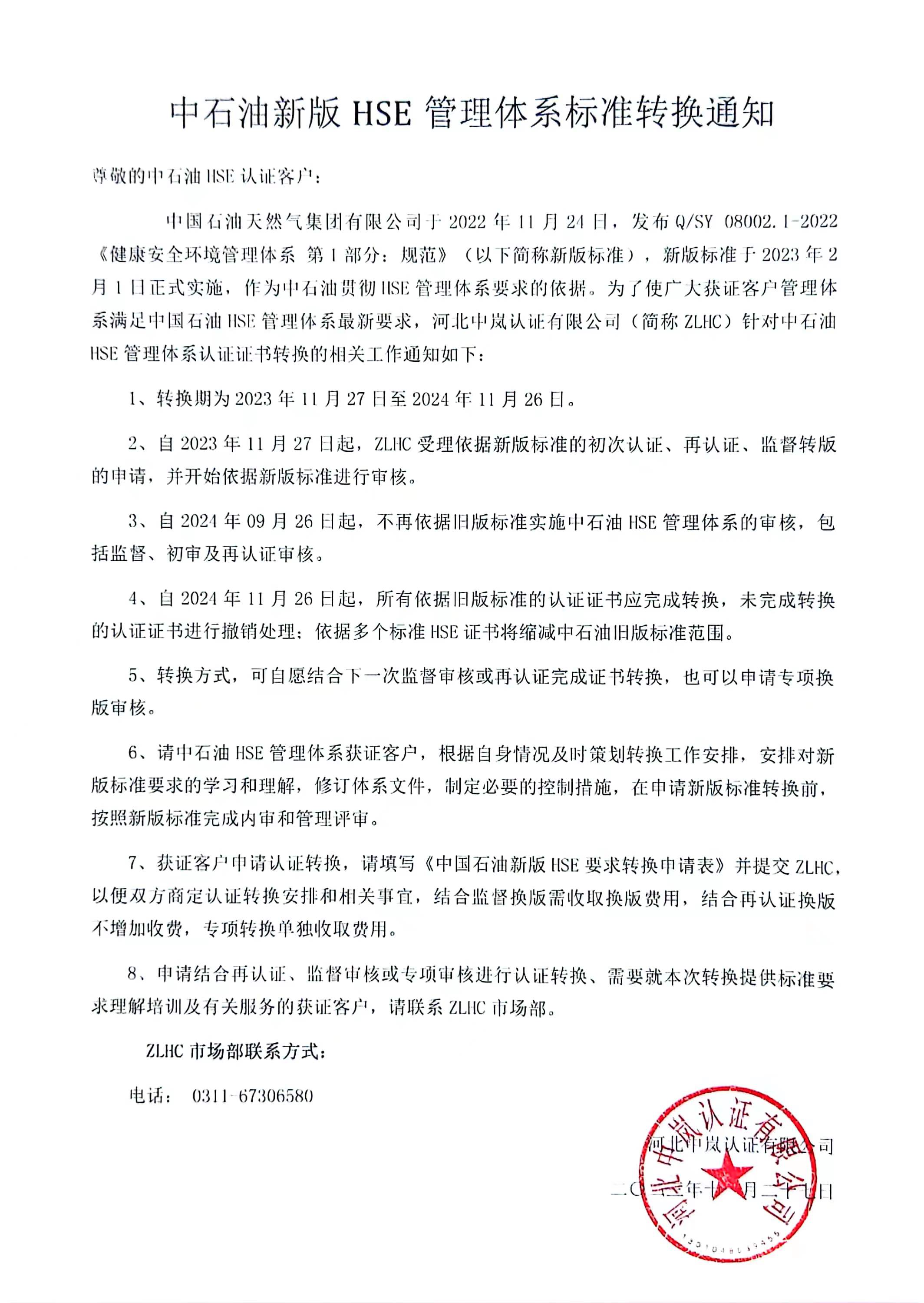 2023年11月27日 中國石油新版HSE管理體系標準轉換通知及申請表